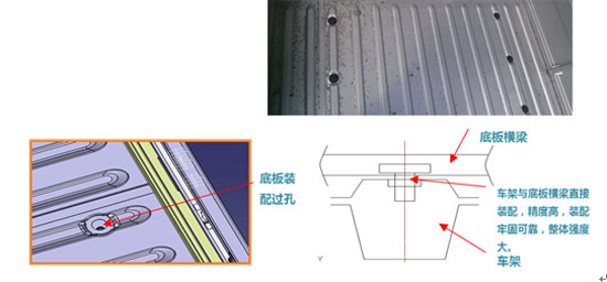 3、橫梁裝配孔設(shè)計元素。解放小卡T80車箱裝配點位于底板橫梁上。橫梁上直接開裝配孔,無裝配支架。直接用螺栓將車箱子與車架相連接。裝配牢固可靠,整體車箱強(qiáng)度增大。