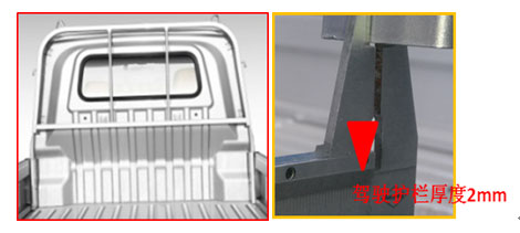 6、防護(hù)攔設(shè)計元素。車箱采用等間距加強(qiáng)筋,寬度達(dá)到31mm,駕駛護(hù)欄與車箱分離,采用厚度2mm鋼板制成,安全可靠。