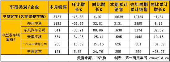 2014年2月份,中型客車(含非完整車輛)銷售3737輛,環(huán)比增長-45.86%,同比增長4.07%。2月份,中型客車(含非完整車輛)銷量前五的企業(yè)依次為:鄭州宇通、東風(fēng)汽車公司、安徽江淮、一汽豐田銷售公司和中通客車,5家合計(jì)銷售2824輛,占中型客車(含非完整車輛)總銷量3737輛的75.57%。從增幅看,中通客車以5.65%的環(huán)比增幅成為唯一環(huán)比正增長的企業(yè),東風(fēng)汽車公司以80.06%的同比增幅成為增長率最高的企業(yè)。