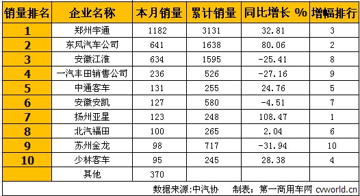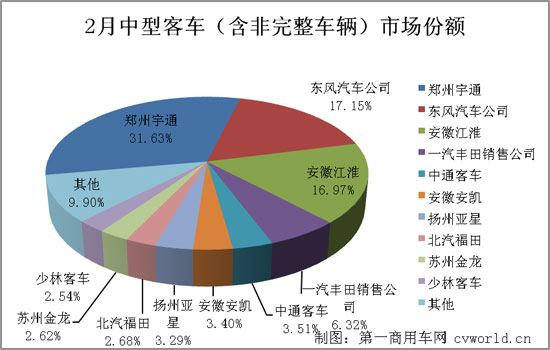2月份,中型客車(含非完整車輛)銷售3737輛,銷量排名前十的企業(yè)共計(jì)銷售3367輛,占據(jù)整個(gè)中型客車(含非完整車輛)銷量份額的90.10%。排名如下: