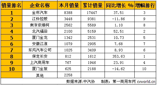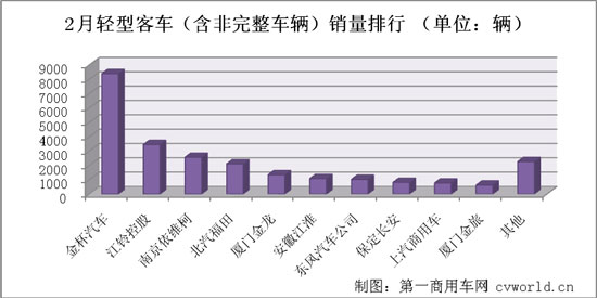 2月份,輕型客車(含非完整車輛)銷售24406輛,銷量排名前十的企業(yè)共計銷售22148輛,占據(jù)整個輕型客車(含非完整車輛)銷量份額的90.75%。排名如下: