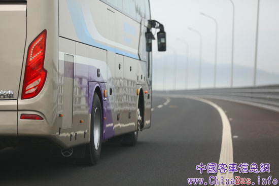 本次試駕的地點(diǎn)是廈漳跨海大橋,這是廈門第1座南北斜拉式跨海大橋,大橋全長(zhǎng)約10 km,由于通車不到1年,路上的車很少,車道很寬,這樣的道路條件非常適合對(duì)一款大型客車進(jìn)行測(cè)試。