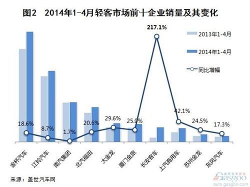 今年前四月,輕客銷量前十企業(yè)依次是金杯汽車、江鈴汽車、南汽集團、北汽福田、大金龍、廈門金旅、長安客車、上汽商用車、蘇州金龍和東風汽車。其中,多數(shù)企業(yè)輕客銷量均快速增長,尤其是長安客車,前四月銷量4855輛,較去年同期激增217%。北汽福田、廈門金旅等企業(yè)增幅均超20%。
