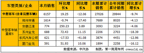 2014年5月份,中型客車(含非完整車輛)銷售6157輛,環(huán)比增長19.25%,同比下降12.06%。5月份,中型客車(含非完整車輛)銷量前五的企業(yè)依次為:鄭州宇通、安徽江淮、蘇州金龍、東風汽車公司和廈門金龍,5家合計銷售4288輛,占中型客車(含非完整車輛)總銷量6157輛的69.64%。從增幅看,環(huán)比上月出現下滑的鄭州宇通和東風汽車公司,與去年同期相比也分別出現17.40%和41.08%的下滑;安徽江淮、蘇州金龍和廈門金龍三家企業(yè)則實現了環(huán)比、同比雙正增長。