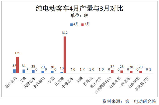 此外,在3月均有純電動客車產(chǎn)出的吉林高新電動、沂星、一汽客車、山西宇星等企業(yè)4月均顆粒無收。由此可見,純電動客車的生產(chǎn)就是以銷定產(chǎn),如果沒有源源不斷的新需求,純電動客車不可能迅速擴(kuò)大產(chǎn)量。