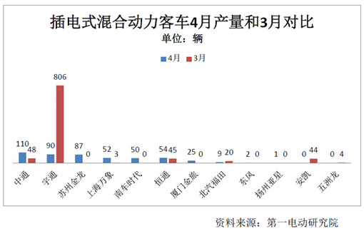 根據(jù)第一電動研究院4月報(bào)顯示,4月,全國生產(chǎn)純電動客車143輛,環(huán)比下跌73.86%,不過同比仍有76.54%的漲幅。插電式混合動力客車的4月產(chǎn)量為480輛,環(huán)比下跌50.52%。