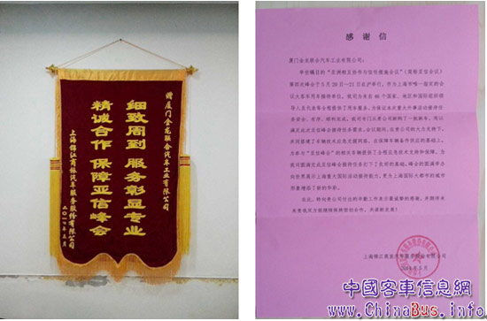 5月21日,亞信第四次峰會圓滿閉幕,金龍客車也以零故障的出色表現(xiàn),順利完成交通運輸服務(wù)。會后,錦江商旅向大金龍發(fā)來熱情洋溢的感謝信,并贈送了錦旗,題字:“細(xì)致周到,服務(wù)彰顯專業(yè);精誠合作,保障亞信峰會!