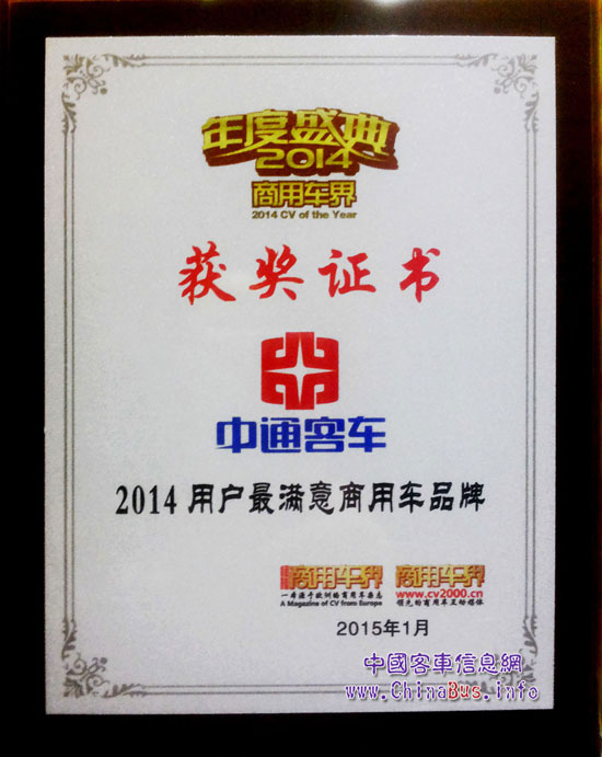 從廣義上講,汽車分為兩類:商用車及乘用車?蛙噷儆谏逃密囶悇e。商用車是指在設(shè)計和技術(shù)特征上用于運送人員和貨物的汽車;在經(jīng)濟用途上,非個人消費品而是以營利為目的運輸工具。中通客車作為商用車界的一員,多年來,堅持以滿足用戶的需求為宗旨,潛心研究如何滿足客戶對產(chǎn)品,對技術(shù),對服務(wù)的需求,努力將各個環(huán)節(jié)做得更好,勤懇的付出與努力,使中通在用戶中建立了良好的口碑。在剛剛過去的2014里,中通客車很榮幸的被評為“2014用戶最滿意商用車品牌”。