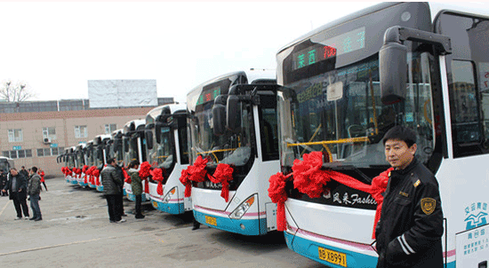 在萊西市汽車總站院內(nèi),記者看到,60部中通嶄新的LNG公交車身披大紅花,整齊地在候車位待命發(fā)車。