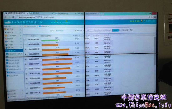 在監(jiān)控中心,大金龍售后技術(shù)人員進一步介紹了新能源安全運行管理,他指著監(jiān)控屏說:“利用智慧云服務平臺系統(tǒng)監(jiān)控,可以查看每輛車的實時剩余電量,電氣系統(tǒng)工作狀態(tài),保障人員能及時反饋車況給駕駛員,并評估車輛是否需要進站補電,而且車輛在充電時電池電流輸入狀態(tài)也能實時顯示。”
