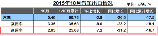 2015年10月商用車出口2.05萬輛,環(huán)比增長7.2%,同比增長-31.2%;1-10月累計(jì)出口25.08萬輛,同比累計(jì)增長-16.7%。9月商用車進(jìn)口0.15萬輛,環(huán)比增長50.2%,同比增長-3.5%;1-9月累計(jì)增長0.97萬輛,同比累計(jì)增長-48.3%。9月,商用車出口3.20萬輛,環(huán)比增長21.1%,同比增長-40.2%;1-9月累計(jì)增長29.59萬輛,同比累計(jì)增長-11.6%。