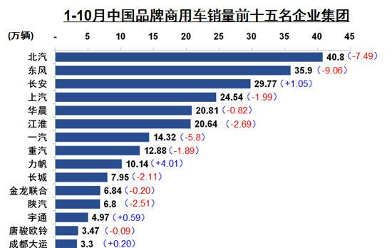 1-10月中國品牌商用車銷量前十五名企業(yè)集團(tuán),金龍聯(lián)合與宇通客車分別位列11位和13位。