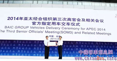 2014年8月5日,“2014年亞太經(jīng)合組織第三次高官會(huì)及相關(guān)會(huì)議官方指定用車交車儀式”在京舉行。福田汽車榮獲“2014年亞太經(jīng)合組織第三次高官會(huì)及相關(guān)會(huì) 議官方指定用車”榮譽(yù)銘牌,將提供多款產(chǎn)品全程服務(wù)APEC系列會(huì)議,其中福田歐輝113臺(tái)城間客車,做為會(huì)議指定擺渡車輛。