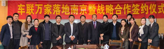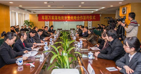 2015年3月5日,車聯(lián)萬家落地南京暨戰(zhàn)略合作簽約儀式在南京報業(yè)傳媒集團舉辦;顒赢斕,車聯(lián)萬家聯(lián)合創(chuàng)始人徐連寬,南京報業(yè)傳媒集團黨委副書記、總經(jīng)理王正文,南京報業(yè)傳媒集團黨委委員、副總編輯陳正榮,南京市交通局維管處處長余迎春,金陵瞭望雜志社總編輯趙文薈、新華網(wǎng)江蘇總編彭亞平、南京維管處處長余迎春、歡樂點點主持人大聰?shù)燃钨e出席簽約儀式。招商銀行、廣發(fā)銀行、中國人民財產(chǎn)保險股份有限公司等金融企業(yè)代表在會上表示將全力支持車聯(lián)萬家項目的南京落地發(fā)展。