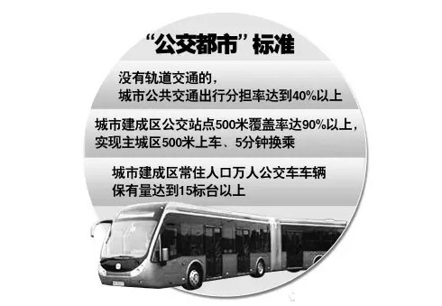 “公交都市”的創(chuàng)建與之前公交優(yōu)先不同的是,“公交都市”必須達到以下標準:有軌道交通的城市公共交通出行分擔率達到45%以上,沒有軌道交通的城市公共交通出行分擔率達到40%以上;城市建成區(qū)公交線網(wǎng)密度3公里/平方公里以上;城市建成區(qū)公交站點500米覆蓋率達到90%以上,實現(xiàn)主城區(qū)500米上車、5分鐘換乘;新能源城市公共交通車輛比例達到5%以上;城市公共交通的乘客測評滿意度達到80%以上;公共汽電車交通責任事故年均死亡率控制在4.5人/萬標臺以內(nèi);城市公共交通相關規(guī)劃體系初步形成;城市公共交通政策和標準規(guī)范體系基本完善;城鄉(xiāng)客運一體化管理格局基本形成。