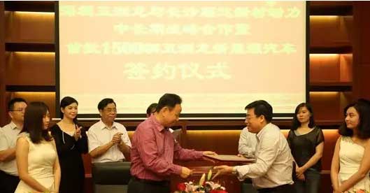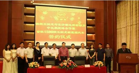 五洲龍汽車集團董事長張景新與長沙順達新材公司董事長劉柏順博士交換簽約協(xié)議