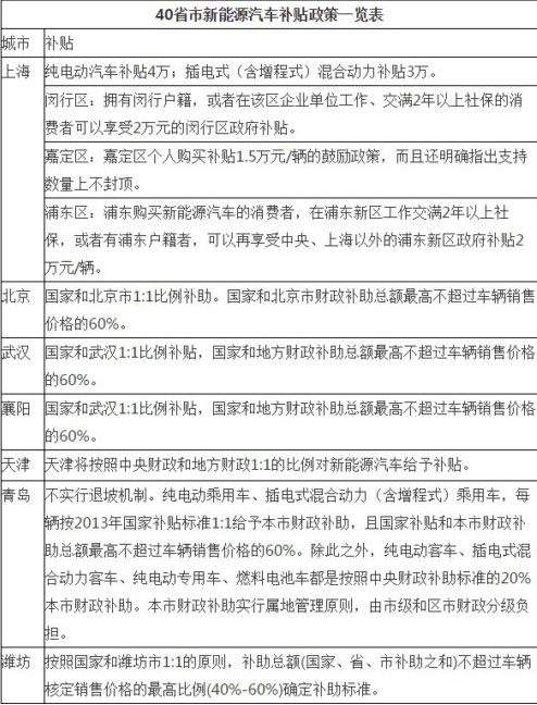 以下為40省市新能源汽車補(bǔ)貼政策對比一覽表