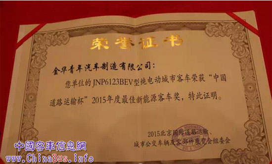 為推動(dòng)我國(guó)客車技術(shù)創(chuàng)新,進(jìn)一步鼓勵(lì)、宣傳和引導(dǎo)新能源客車的研發(fā)應(yīng)用,“2015北京國(guó)際道路運(yùn)輸、城市公交車輛及零部件展覽會(huì)”在北京國(guó)家會(huì)議中心隆重舉辦。5月11日晚"中國(guó)道路運(yùn)輸杯"評(píng)獎(jiǎng)揭曉,青年JNP6123BEV純電動(dòng)客車榮獲“2015年度最佳新能源客車獎(jiǎng)”。
