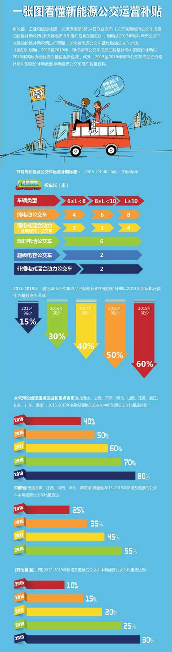 2015-2019年現(xiàn)行公交車油補以2013年標準作為基數(shù)逐步遞減,2019年將減少60%,同時對完成新能源公交推廣目標的地區(qū)給予運營補貼。