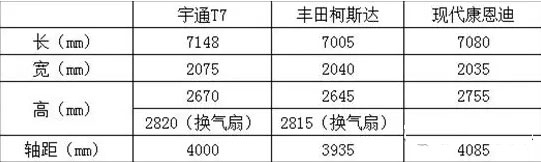 從長、寬、高、軸距等基本參數(shù)來看,宇通T7比豐田柯斯達(dá)、現(xiàn)代康恩迪都“壯”一些。而宇通T7和豐田柯斯達(dá)都有配置換氣扇的版本,這一方面現(xiàn)代康恩迪有所欠缺。