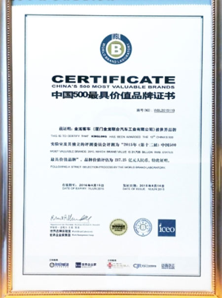 當(dāng)前,無(wú)論是國(guó)內(nèi)還是海外市場(chǎng),中國(guó)客車(chē)企業(yè)的競(jìng)爭(zhēng)已進(jìn)入“品牌競(jìng)爭(zhēng)”的時(shí)代。持續(xù)12年入選“中國(guó)500最具價(jià)值品牌”是對(duì)大金龍領(lǐng)先的行業(yè)地位和良好品牌形象的肯定,也將激勵(lì)大金龍繼續(xù)為提升民族客車(chē)品牌影響力而努力。