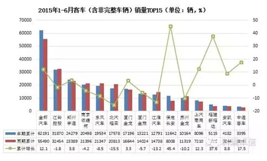 根據(jù)最新數(shù)據(jù)統(tǒng)計(jì),2015年6月國(guó)內(nèi)客車(chē)(含非完整車(chē)輛)產(chǎn)量54212輛,累計(jì)產(chǎn)量284905輛,同比增長(zhǎng)5.23%,累計(jì)增長(zhǎng)3.84%;本月國(guó)內(nèi)客車(chē)銷(xiāo)量50868輛,累計(jì)銷(xiāo)量281955輛,同比下降2.66%,累計(jì)增長(zhǎng)0.91%。其中金杯汽車(chē)?yán)塾?jì)銷(xiāo)量排名第一,累計(jì)增幅達(dá)12.1%,累計(jì)銷(xiāo)售62191輛;保定長(zhǎng)安累計(jì)增幅為45.4%,累計(jì)銷(xiāo)量11642輛;北汽福田累計(jì)銷(xiāo)量下降15.5%,是銷(xiāo)量前15名企業(yè)中,累計(jì)銷(xiāo)量降幅最大的企業(yè),但仍可以看出今年整體客車(chē)行業(yè)形勢(shì)良好。