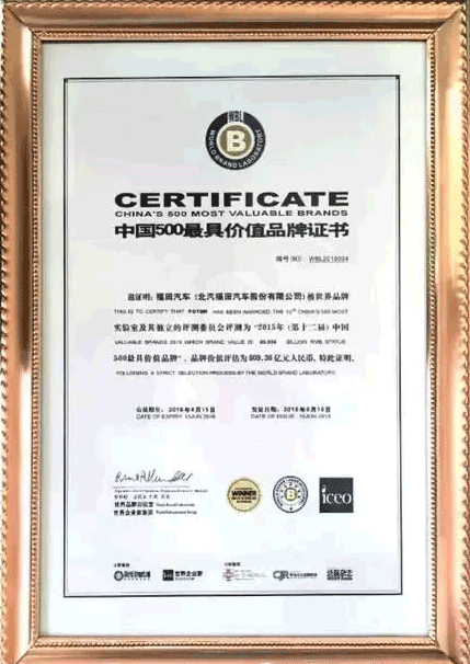 6月16日,世界品牌實驗室在京頒布2015年《中國500最具品牌價值》排行榜。福田汽車以809.36億元的品牌價值,名列總排名第34位,在汽車行業(yè)穩(wěn)居第4位,商用車行業(yè)第一,福田汽車連續(xù)十一年持續(xù)領航中國商用車市場發(fā)展。