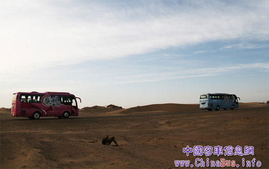 行駛在西域沙漠的金龍客車