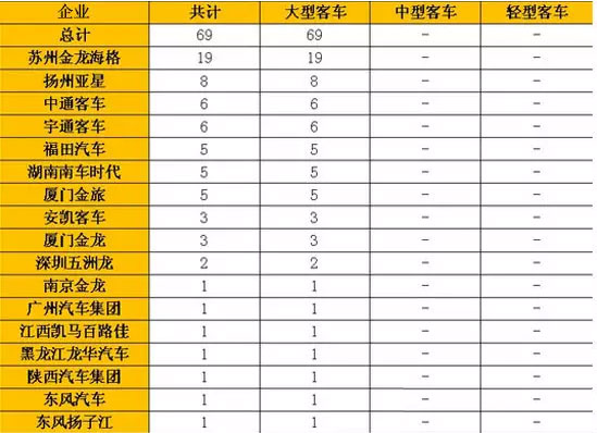 在前后四批《免征車輛購(gòu)置稅的新能源汽車車型目錄》中,共有70款插電式混合動(dòng)力客車,比純電動(dòng)客車的數(shù)量差之甚遠(yuǎn)。由此也可見(jiàn)國(guó)家對(duì)于純電動(dòng)汽車的支持力度。其中,插電式混合動(dòng)力城市客車69款,另外1款為中通10米級(jí)插電式混合動(dòng)力座位客車,具體數(shù)據(jù)如下: