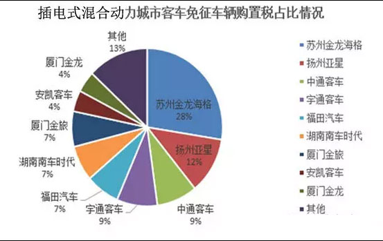 滿足免征車型購(gòu)置稅要求的大型城市客車共69款。其中,蘇州金龍以19款車型、28%的占比排名第一;宇通作為新能源客車領(lǐng)域的佼佼者,共有6款插電式混合動(dòng)力城市客車滿足免征車型購(gòu)置稅要求。