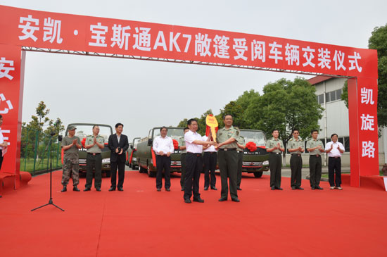 交車儀式上安凱客車領(lǐng)導(dǎo)向軍方代表交付新車鑰匙