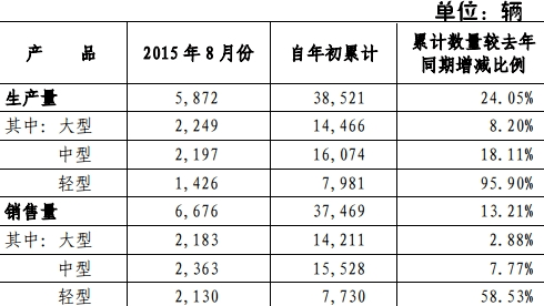 9月7日,鄭州宇通客車股份有限公司發(fā)布2015年8月份產(chǎn)銷數(shù)據(jù)快報(bào)。報(bào)告顯示,8月份,宇通客車銷售客車6676輛,同比增長17.97%,具體為,銷售大型客車2183輛,中型客車2363輛,輕型客車2130輛;1-8月份累計(jì)銷售37469輛,同比增長13.21%;8月份,生產(chǎn)客車車5872輛,同比下降1.23%,具體為,生產(chǎn)大型客車2249輛,中型客車2197輛,輕型客車1426輛;1-8月累計(jì)產(chǎn)車38521輛,同比增長24.05%。