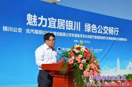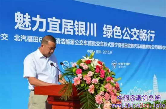 2015年9月6日,在美麗的西北明珠——銀川,由福田歐輝客車(chē)舉辦的“魅力宜居銀川 綠色公交暢行”626臺(tái)清潔能源公交車(chē)首批交車(chē)儀式圓滿(mǎn)舉行;顒(dòng)上,寧夏回族自治區(qū)交通廳巡視員安家明、銀川市交通運(yùn)輸局副局長(zhǎng)、銀川公交公司總經(jīng)理柯念國(guó)、銀川公交公司黨委書(shū)記、副總經(jīng)理徐建鋒、副總經(jīng)理盧鵬,福田汽車(chē)集團(tuán)副總裁、歐輝客車(chē)總經(jīng)理范現(xiàn)軍、歐輝客車(chē)黨委副書(shū)記、紀(jì)委書(shū)記彭博以及來(lái)自銀川公交公司和福田歐輝客車(chē)的員工代表共計(jì)100人參與了本次活動(dòng)。