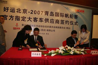 4月24日,蘇州金龍客車公司與青島奧帆委在青島簽訂了合作協(xié)議,蘇州金龍自行投入生產(chǎn)的20臺海格客車將于7月25日前制作完畢并運(yùn)抵青島,用于2007青島國際帆船賽的賽事交通服務(wù)用車,使用期為一個月。