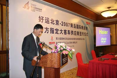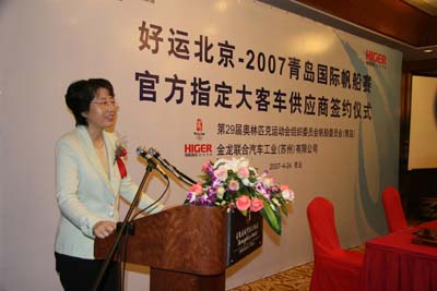 蘇州金龍客車公司執(zhí)行董事顏明在合作協(xié)議簽署儀式上表示,蘇州金龍與第29屆奧林匹克運(yùn)動會組織委員會帆船委員會合作,海格客車成為2007青島國際帆船賽指定服務(wù)用車,這不僅是奧帆委對海格客車的認(rèn)可,也賦予了蘇州金龍全面服務(wù)國際帆船賽,確保賽事交通順暢運(yùn)行的重要責(zé)任。