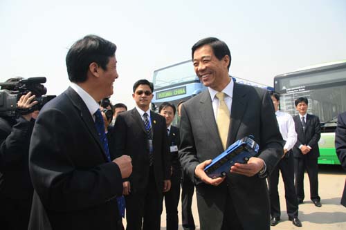 2007年4月27日上午,宇通工業(yè)園迎來了一位特殊的 “客人” ——國家商務(wù)部部長薄熙來。在河南省省長李成玉的陪同下, 薄熙來一行對宇通的生產(chǎn)線和新車進(jìn)行了參觀訪問。當(dāng)看到宇通從2000年薄熙來初次參觀時的12.5億銷售收入迅速攀升至2006年的101.398億元時,薄熙來當(dāng)場風(fēng)趣地稱贊到:“宇通7年里的變化太大了,增長太快了,現(xiàn)在的宇通就象是老太太踩電門——抖起來了?!?/P>
