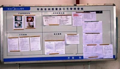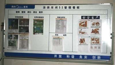在美的客車總裝車間里,首先映入記者眼簾的是一排排目視看板,與以前相比,目視看板多了很多?,F(xiàn)場人員告訴記者,這是公司進一步推行精益生產(chǎn)方式的成果。在車間參觀過程中,記者注意到,目視化看板上寫滿了精益生產(chǎn)方式和現(xiàn)場5S管理的要點、現(xiàn)場改善案例以及5S問題點改善數(shù)據(jù)記錄表;同時,整個車間雖然繁忙,但整齊有序,一點也不凌亂,而車間文化看板,讓人更多地感受到了美的對員工的人性化關(guān)注。