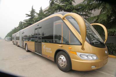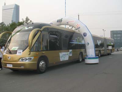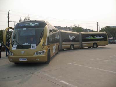 在出租車(chē)上的時(shí)候聽(tīng)廣播,新聞中關(guān)于11月15日在上海開(kāi)幕的第九屆米其林必比登挑戰(zhàn)賽特別提到了宇通25米超長(zhǎng)公交車(chē)ZK6251G,這款車(chē)曾經(jīng)在北京亮相過(guò),據(jù)舉辦方介紹這是本次挑戰(zhàn)賽也是目前國(guó)內(nèi)最長(zhǎng)的公交車(chē)。抵達(dá)此次挑戰(zhàn)賽的主會(huì)場(chǎng),上海西北部的安亭汽車(chē)會(huì)展中心,終于有機(jī)會(huì)一睹他的威儀:子彈頭般的動(dòng)感車(chē)頭、流線型的車(chē)身、金光閃閃的漆面、舒展的超長(zhǎng)車(chē)廂,如同一位披堅(jiān)執(zhí)銳的黃金甲士。遠(yuǎn)遠(yuǎn)的就看到這款車(chē)已成為眾人追捧的對(duì)象,觀眾、廠商以及工作人員都在紛紛與之合影,就連米其林輪胎先生也不愿放棄這個(gè)機(jī)會(huì),挪到車(chē)旁擺出姿勢(shì)等待快門(mén)的按響。