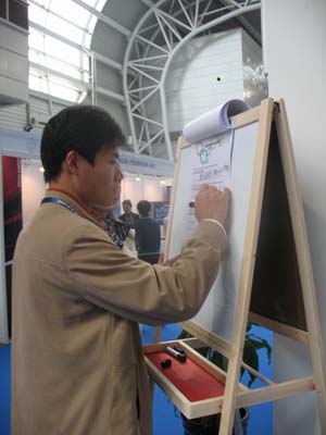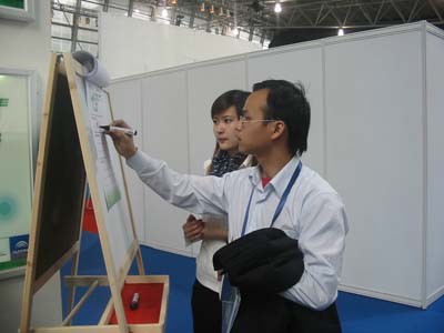 在展場(chǎng)中宇通的展位上,工作人員正跟一家在江蘇有合資廠的歐洲客車(chē)廠商交談,歐洲人用了很多形容詞來(lái)表達(dá)他對(duì)“黃金子彈頭”的欣賞,而一旁的翻譯頗顯時(shí)尚,居然直接翻譯成:他說(shuō)這里要“滿城盡議黃金甲”了!