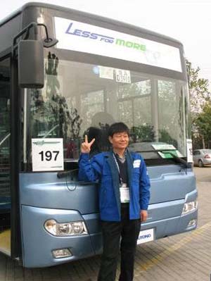 在正式進(jìn)行技術(shù)比武的前一天,很多參賽車(chē)輛在賽場(chǎng)做訓(xùn)練,一輛車(chē)在將近120秒的時(shí)間內(nèi)完成了鉆桿項(xiàng)目,讓組織方的工作人員頗覺(jué)欣慰;魏師傅駕駛著宇通的ZK6126HGA,84秒輕松完成!組織方的工作人員大為驚異,宇通的工作人員急忙小聲提醒“保留實(shí)力!保留實(shí)力!”。魏師傅連忙邊點(diǎn)頭邊嘀咕“沒(méi)辦法,車(chē)的操控性太好,這主要是車(chē)的原因不是人的問(wèn)題”。賽前,豪爽、風(fēng)趣的魏師傅還讓我給他拍下了這張預(yù)示勝利的照片。