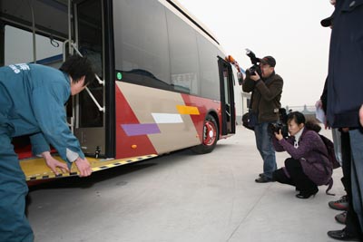 恒通工人向記者演示殘疾人通道的使用