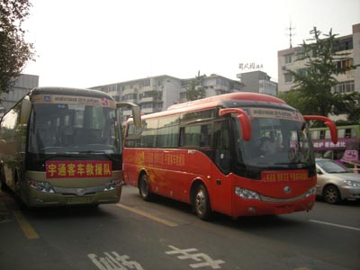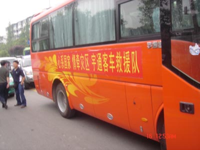 而宇通派駐在四川災(zāi)區(qū)工作的員工,也于14日上午,在宇通領(lǐng)導(dǎo)的指示下,在川渝大區(qū)經(jīng)理的主持下,迅速組成了一支“宇通救援隊”。這是一支由川渝大區(qū)經(jīng)理等業(yè)務(wù)人員、售后人員、司機以及3輛宇通客車組成的特殊愛心團隊。他們的旗幟熱烈而又包含深情——“心系國家,情牽災(zāi)區(qū)”,他們的成員有3輛宇通精品客車和多名經(jīng)驗豐富的宇通業(yè)務(wù)、服務(wù)人員及司機,他們的戰(zhàn)場是分秒必爭而又運力有限的災(zāi)區(qū)前線,他們的任務(wù)是接送救災(zāi)人員以及轉(zhuǎn)移災(zāi)區(qū)群眾,他們的身后是萬名宇通集團員工的重托和祝愿!