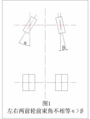 前輪前束,正前束有使車輪向車輛縱向中心線方向運(yùn)動的趨勢,如果兩邊車輪的前束角不相等(如圖1),車輛會朝著前束小的一邊跑偏。