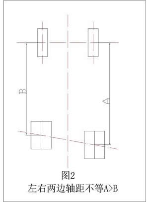2)、橋移位,導(dǎo)致車輛左右兩邊的軸距不等,如圖2所示。
