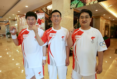 7月25日起,北京奧運(yùn)圣火將在河南省進(jìn)行傳遞,屆時(shí),將經(jīng)歷鄭州、開封、洛陽及安陽等城市。奧運(yùn)官網(wǎng)記者親赴河南,獨(dú)家采訪眾多河南火炬手。圖為來自于宇通客車的三名火炬手握緊拳頭為奧運(yùn)加油。