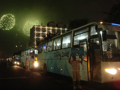 奧運(yùn)會(huì)開(kāi)幕式當(dāng)天海格客車(chē)車(chē)隊(duì)與漫天煙火交相輝映
