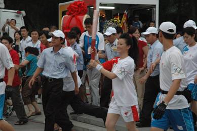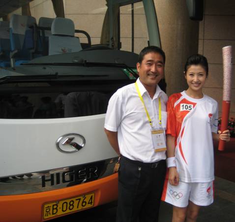 在圣火傳遞中,最富親情的當(dāng)屬第105棒火炬手春妮的夫妻配,春妮是北京電視臺(tái)的主持人,她和丈夫蔣虎分享了當(dāng)天的傳遞路程,夫妻倆人聯(lián)手高舉 “ 祥云 ” ,面帶笑意,將幸福和溫馨的情感傳遞給在場(chǎng)的每一個(gè)人。為了紀(jì)念這一人生的特別時(shí)刻,專門為火炬手服務(wù)的一位海格客車司機(jī)楊洪在征得春妮同意后,有幸在自己的大巴前同她合影。