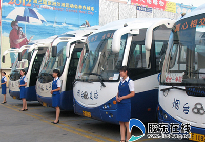 煙臺(tái)交運(yùn)集團(tuán)海陽(yáng)車站分公司的孫經(jīng)理向我們介紹道,為迎接第三屆亞洲沙灘運(yùn)動(dòng)會(huì),他們?cè)谕晟朴布?wù)的同時(shí),抓好司乘人員服務(wù),今年組織了四期培訓(xùn),所有司乘人員都經(jīng)過(guò)了軍訓(xùn)、禮儀服務(wù)技能訓(xùn)練、旅游知識(shí)和“亞沙”知識(shí)學(xué)習(xí),乘務(wù)員能夠達(dá)到簡(jiǎn)單英語(yǔ)對(duì)話能力。目前,公司實(shí)行航空式服務(wù)的車輛主要是中遠(yuǎn)途車,近20輛,今后數(shù)量將不斷擴(kuò)大。