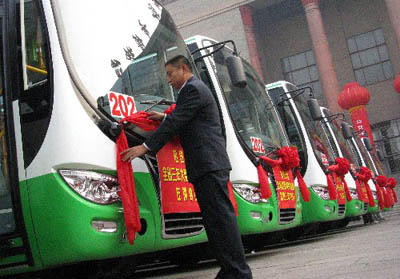 11月11日,一位工作人員在邯鄲市博物館廣場裝飾即將投入運營的新型節(jié)能環(huán)保公交車。當日,河北省邯鄲市公交總公司新引進的180輛新型節(jié)能環(huán)保公交車正式投入使用。據悉,這批節(jié)能環(huán)保公交車采用雙燃料裝置,投入使用后將有效減少公交車尾氣對城市空氣的污染。