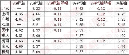 據(jù)國家發(fā)改委網(wǎng)站消息,近日,國家發(fā)展改革委發(fā)出通知,決定自1月15日零時起將汽、柴油價格每噸分別降低140元和160元。上個月的19日,國內(nèi)成品油價格曾進行過一次調(diào)整,在不到一個月的時間內(nèi),國家發(fā)改委昨天再次宣布下調(diào)汽油、柴油價格。中石油、中石化也按照國家發(fā)改委通知統(tǒng)一調(diào)整成品油價格,目前網(wǎng)易汽車收集到全國10大城市的幾種型號油價及降幅,如下表: